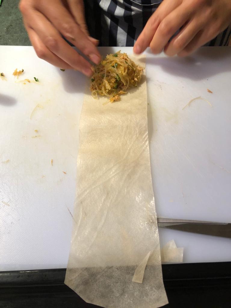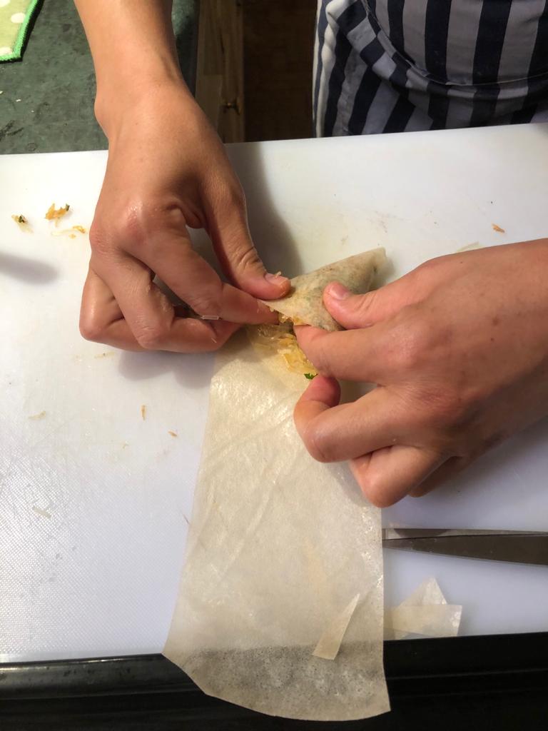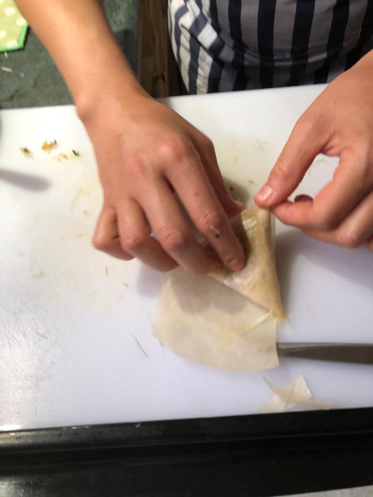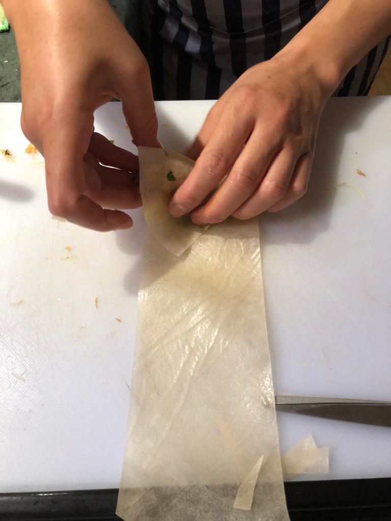 Mit einer Mehl/Eiweiss Mischung wird der hauchdünne Blätter-Teig dann verschlossen. ✅ Anschließend frittiert.