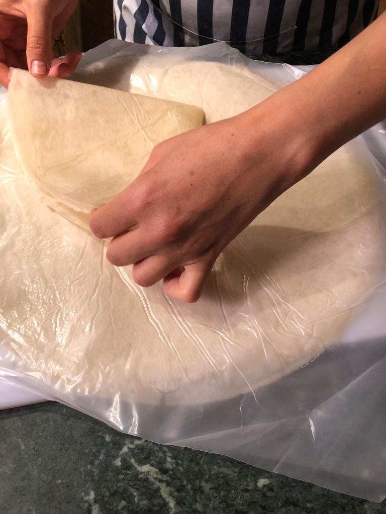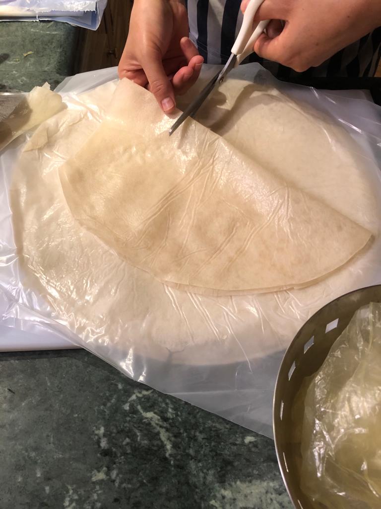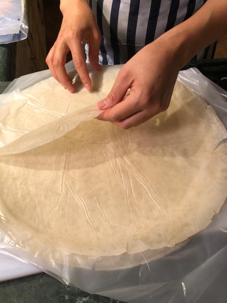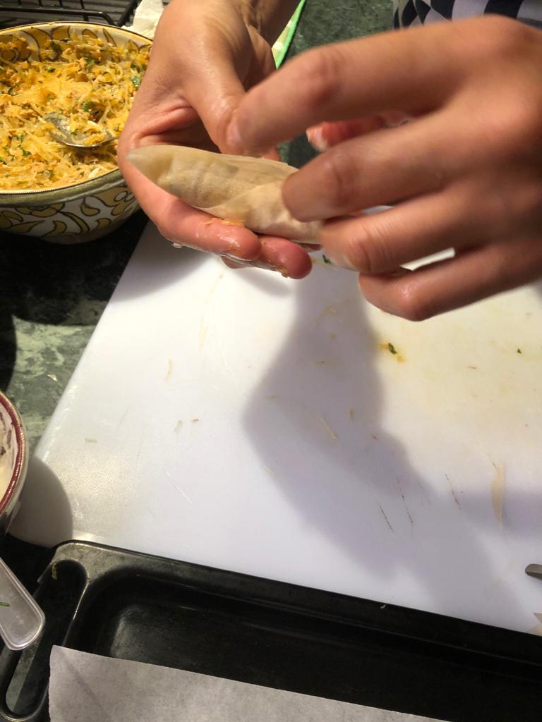 Mit einer Mehl/Eiweiss Mischung wird der hauchdünne Blätter-Teig dann verschlossen. ✅ Anschließend frittiert.